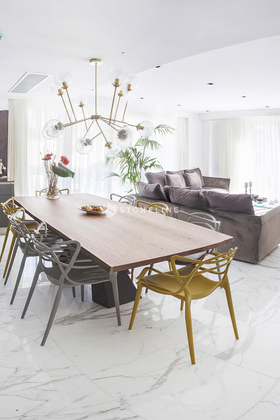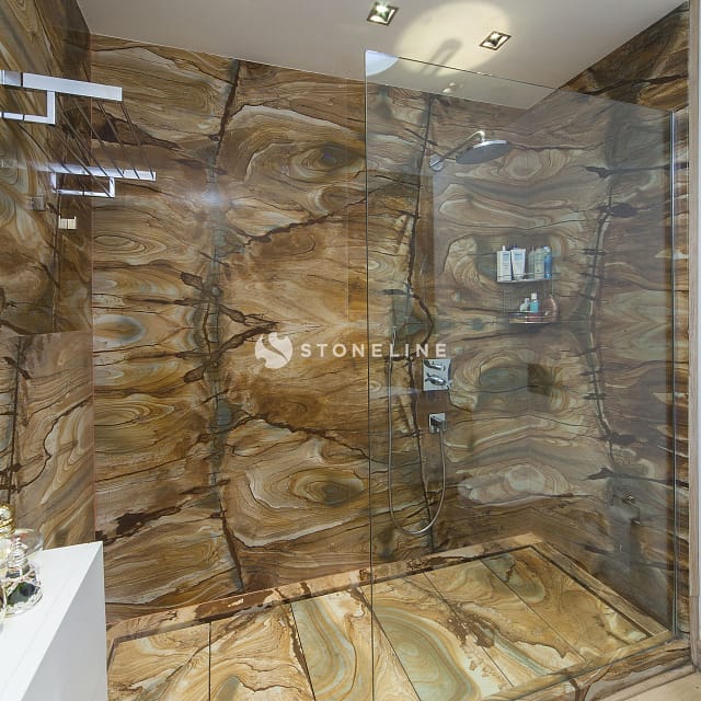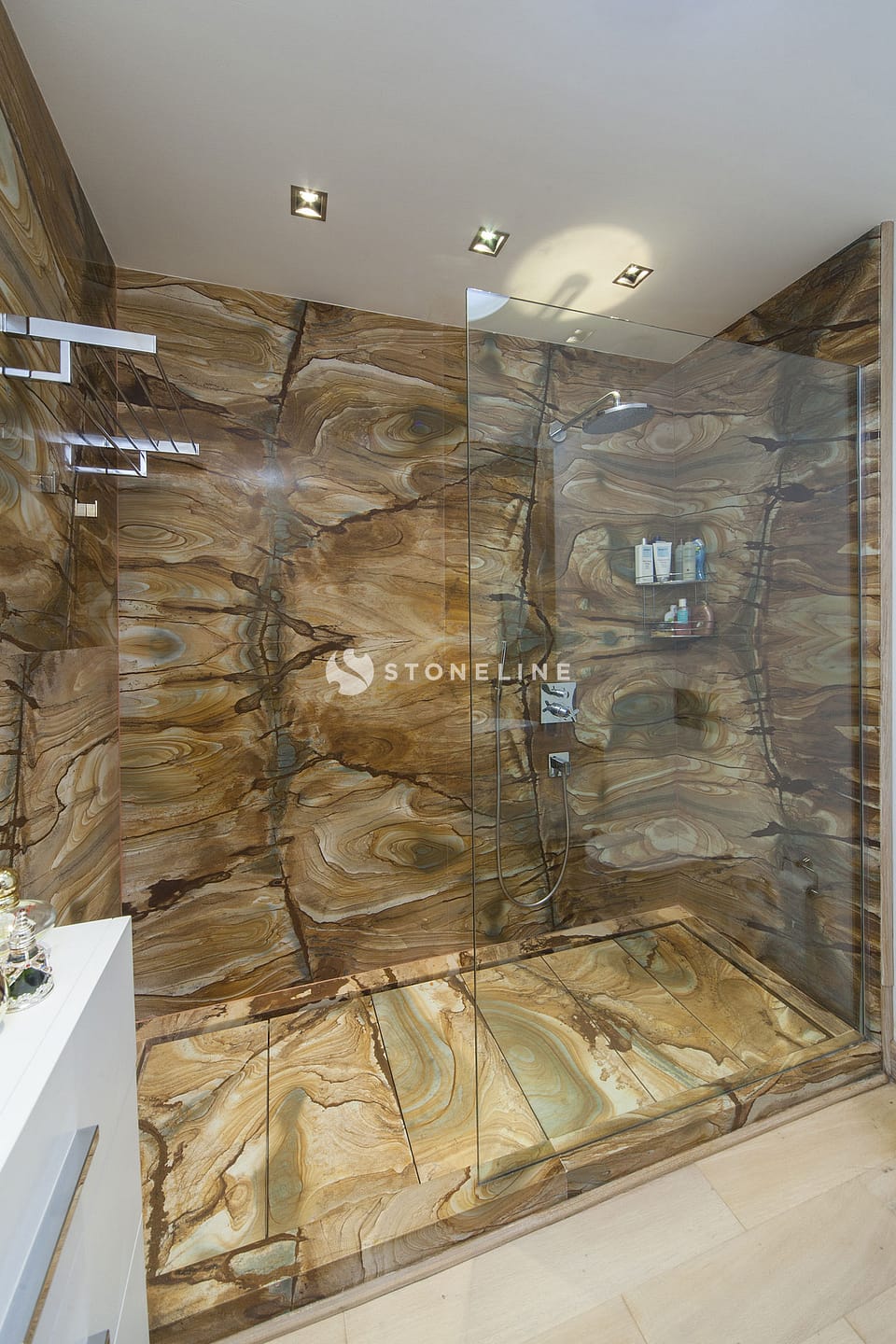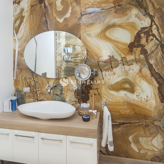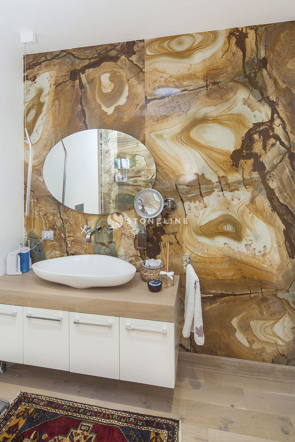 Statuario – one of the most renowned and preferred marbles in the world – is the choice of the designer for kitchen, living room and hallway floors to add radiance, spaciousness and style. Consisting of various hues of yellow, Stonewood creates a very natural and cosy atmosphere in the bathroom.