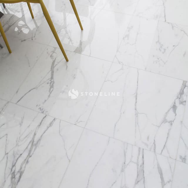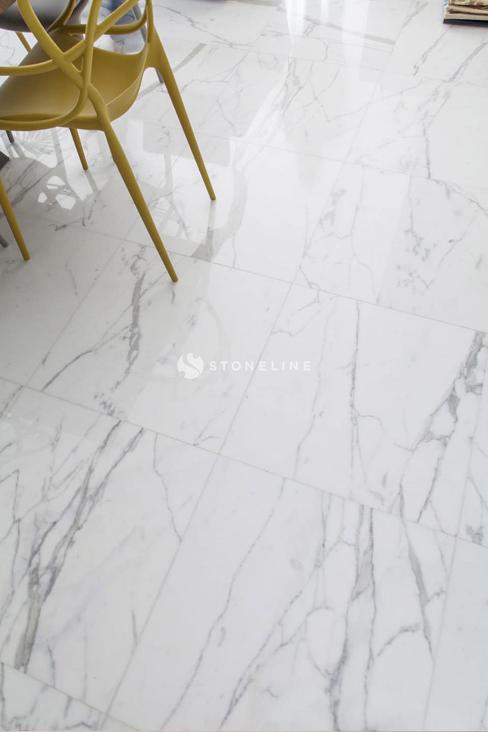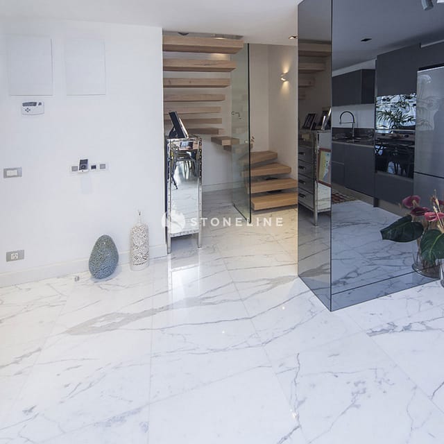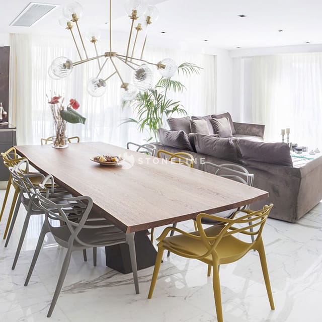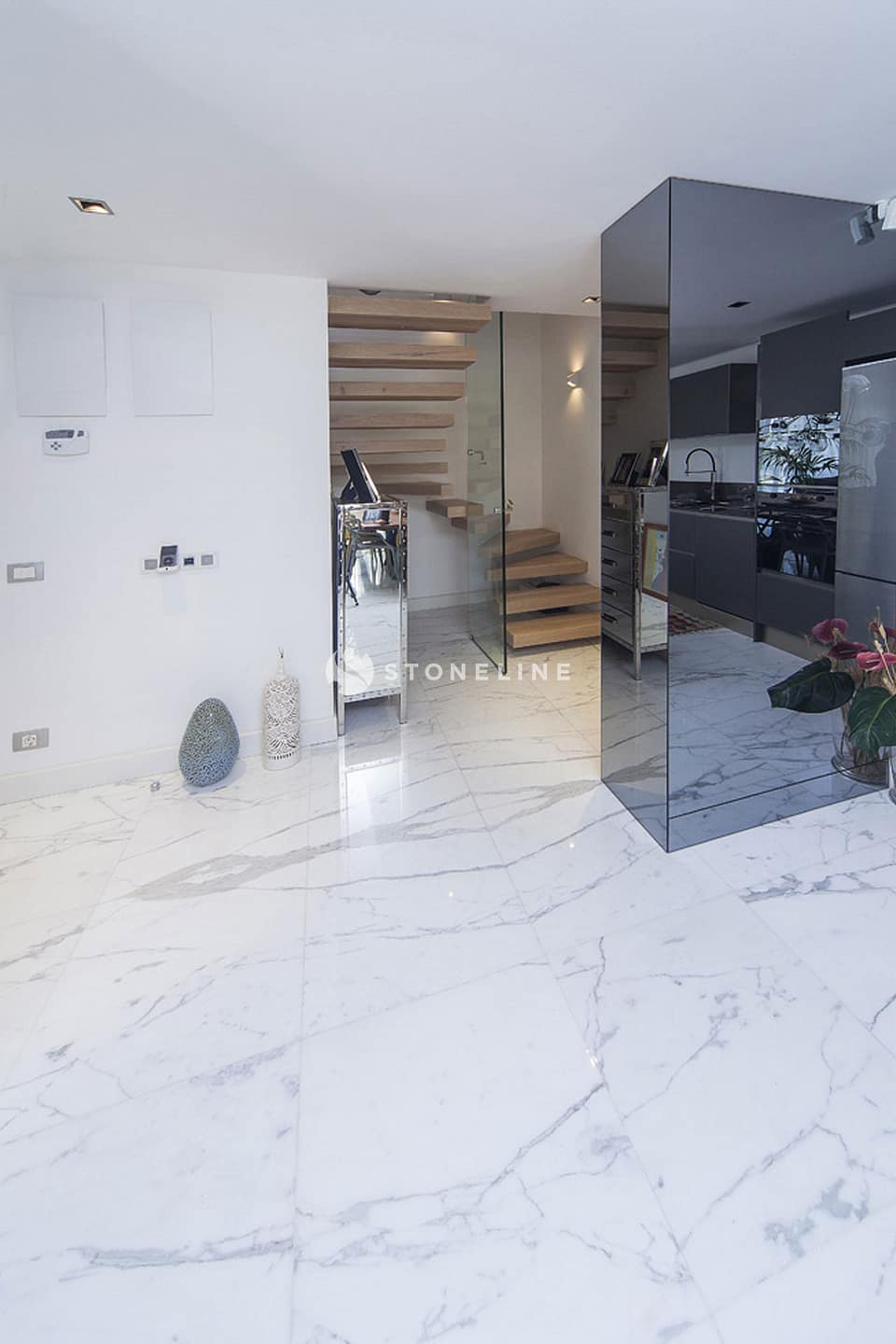 Statuario – one of the most renowned and preferred marbles in the world – is the choice of the designer for kitchen, living room and hallway floors to add radiance, spaciousness and style. Consisting of various hues of yellow, Stonewood creates a very natural and cosy atmosphere in the bathroom.