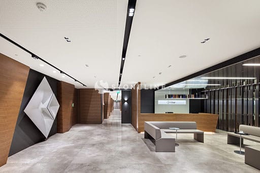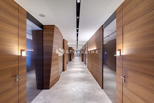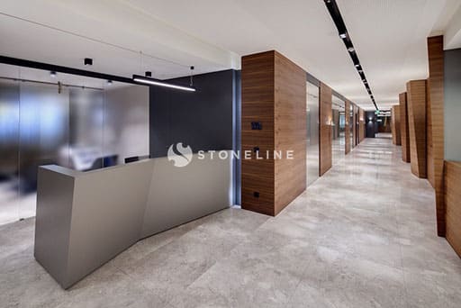 This office project targets at creating a lean and stylish ambiance. For this reason, Ivory Grey was chosen as it reflects the harmony between beige and grey the best. You can also discover hundreds of stones from the natural stone selection of Stoneline for office designs.