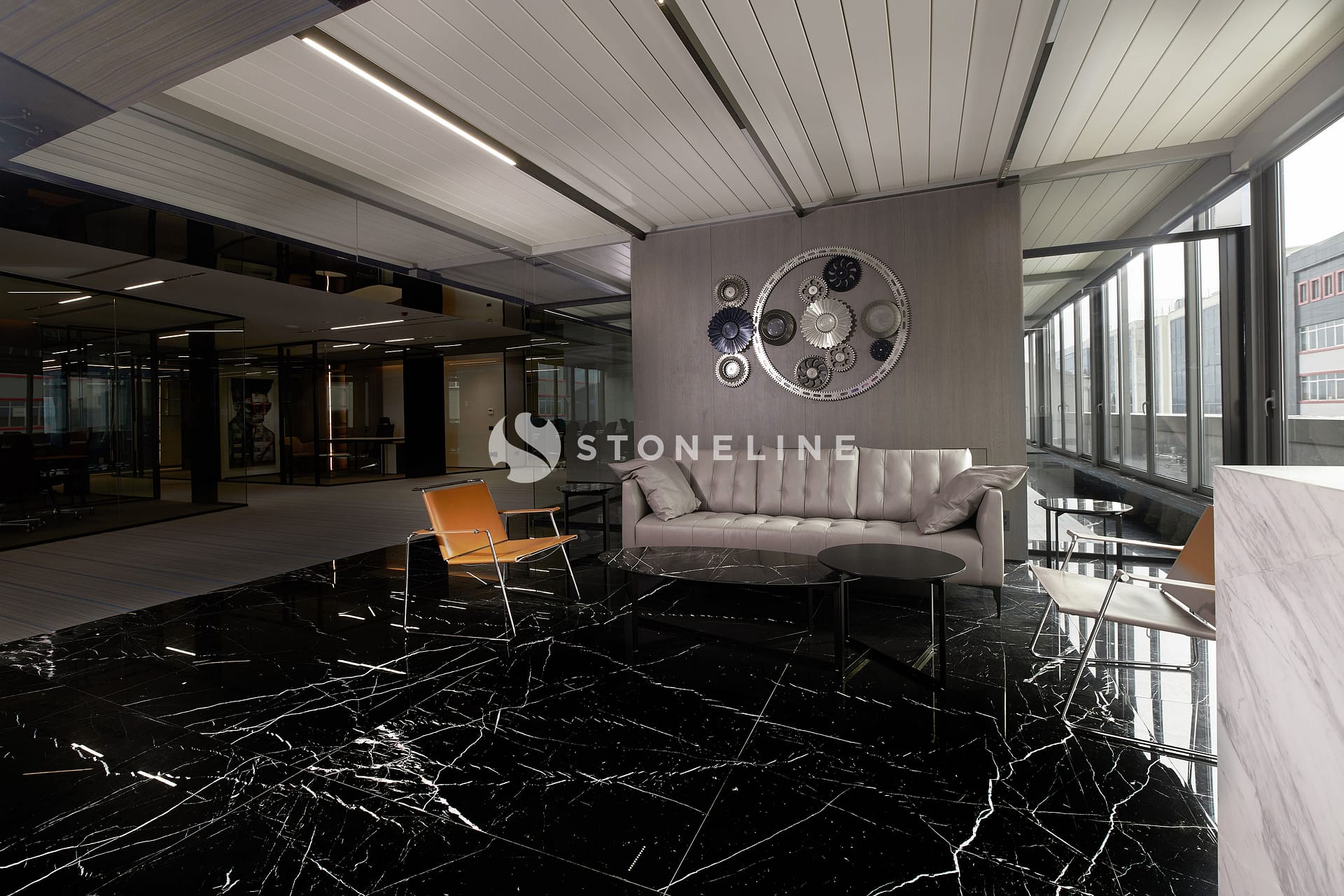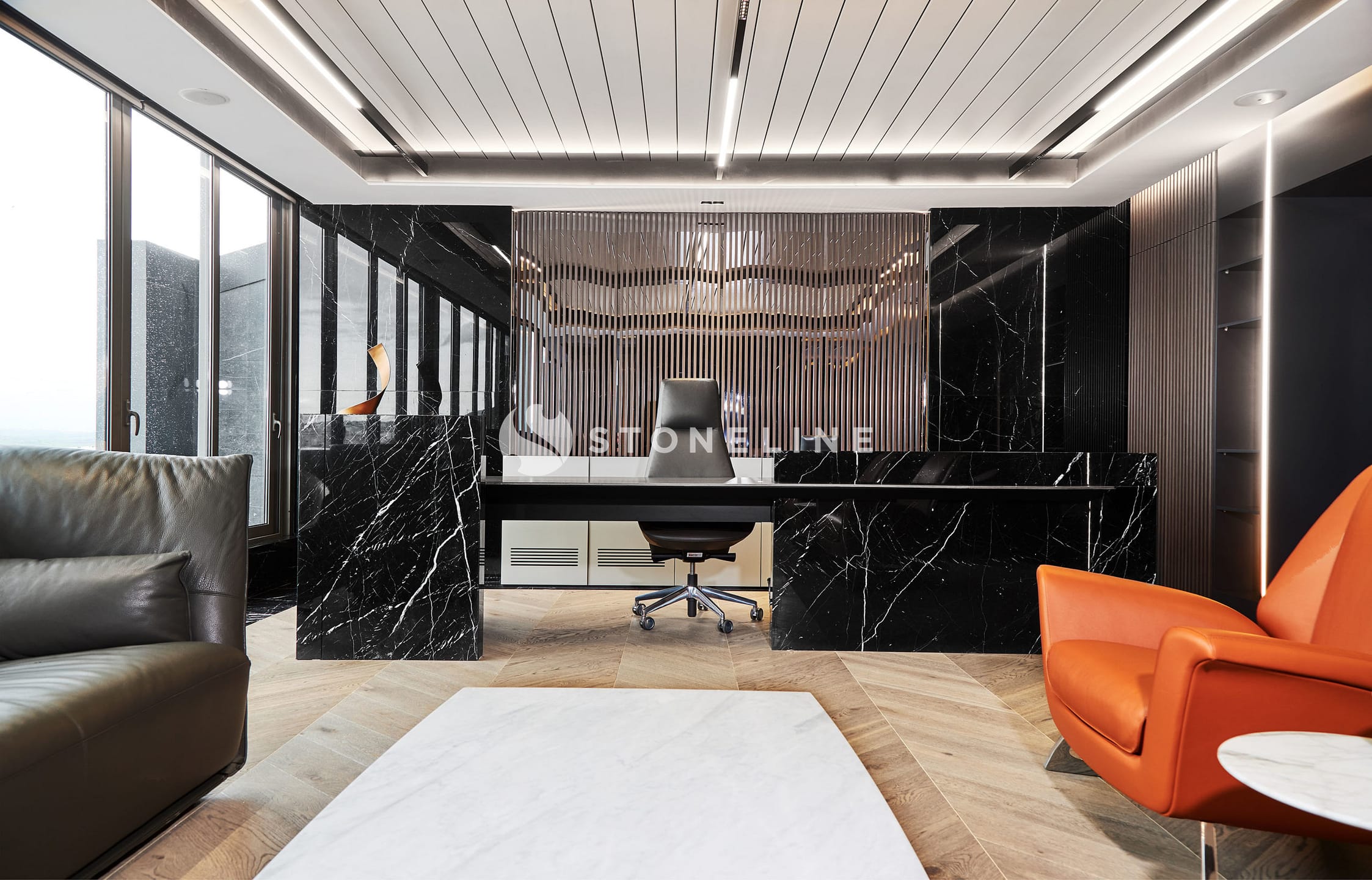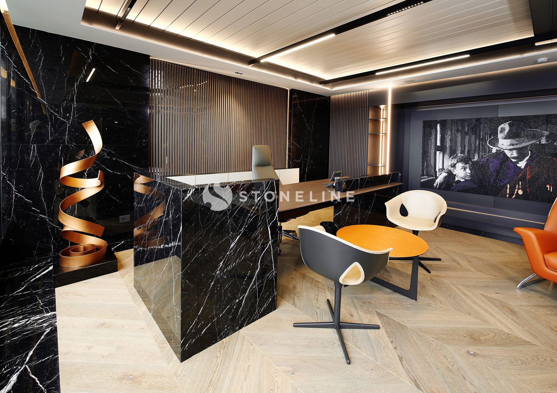 This office is fine tuned to a minimalist approach. The soft lines and contrasting colors make Volacas Extra and King Black the lead actors of this unique project. You can make use of Stoneline’s natural stone collection in your fireplace designs.