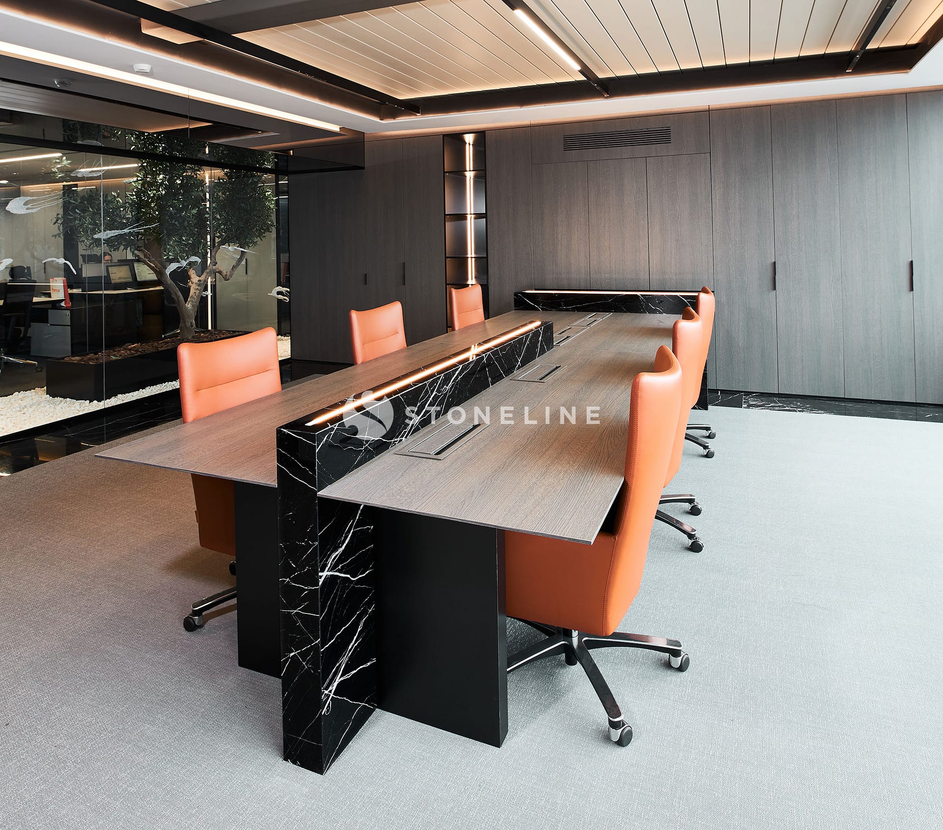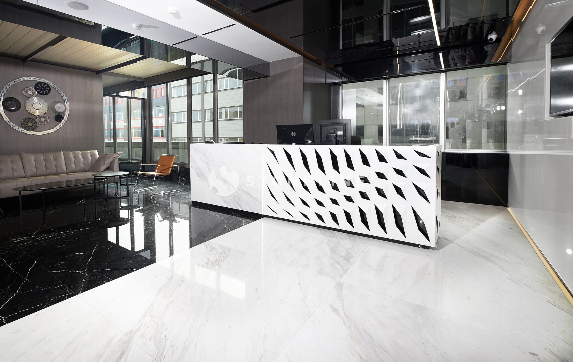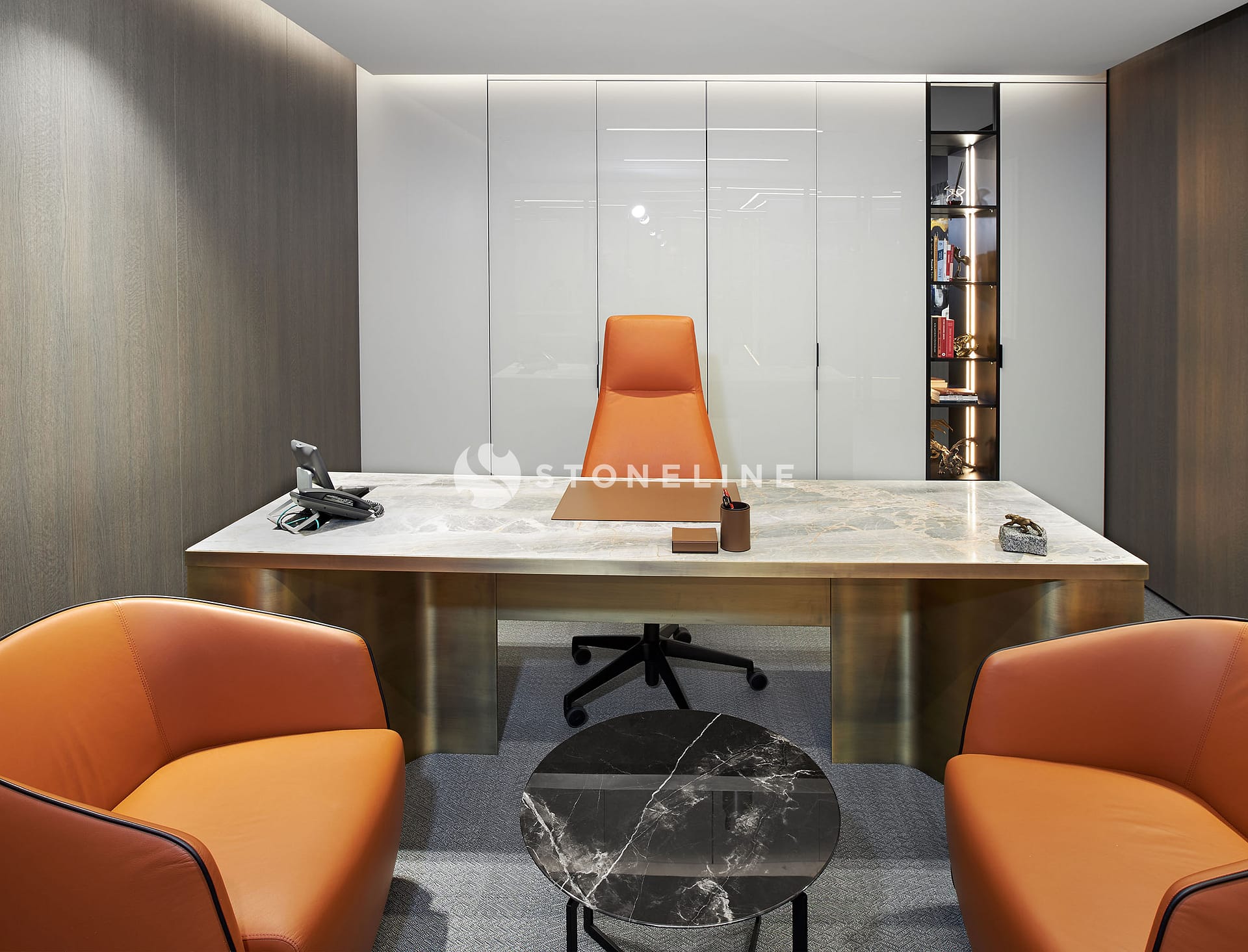 This office is fine tuned to a minimalist approach. The soft lines and contrasting colors make Volacas Extra and King Black the lead actors of this unique project. You can make use of Stoneline’s natural stone collection in your fireplace designs.