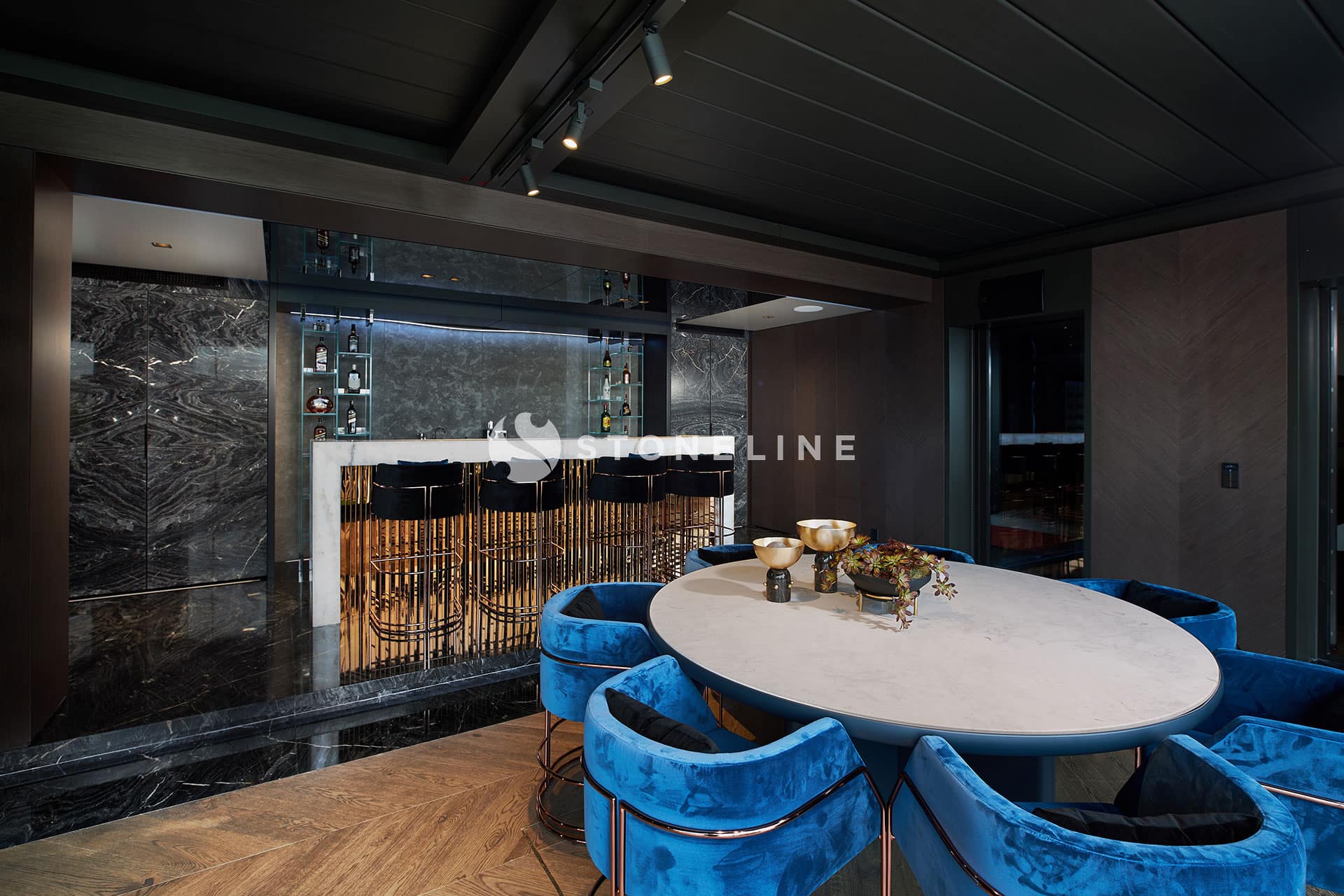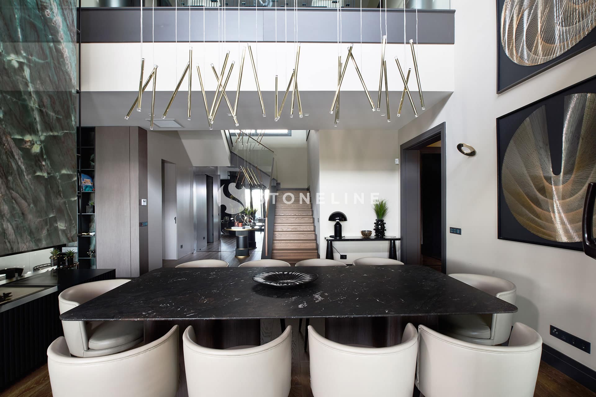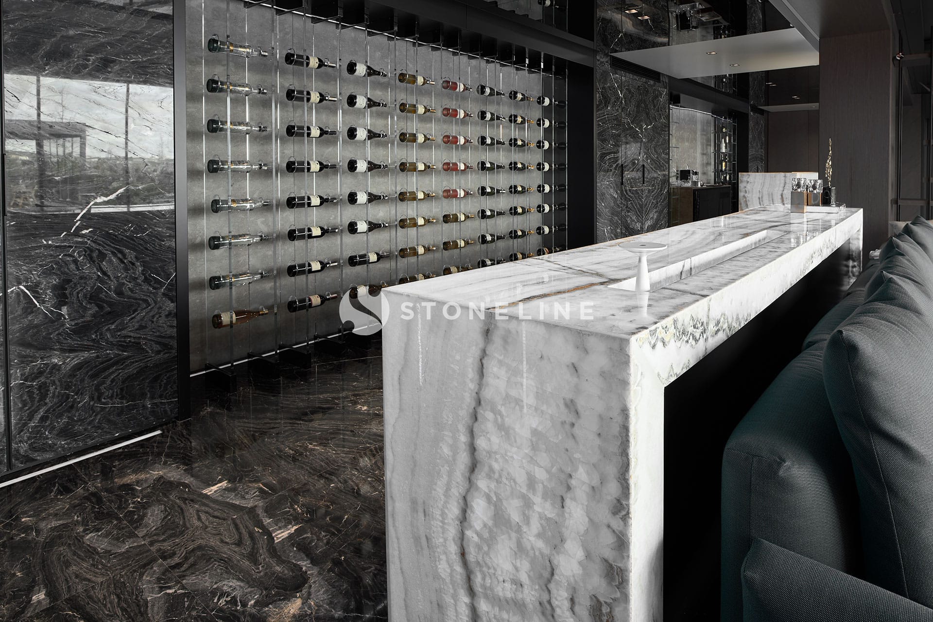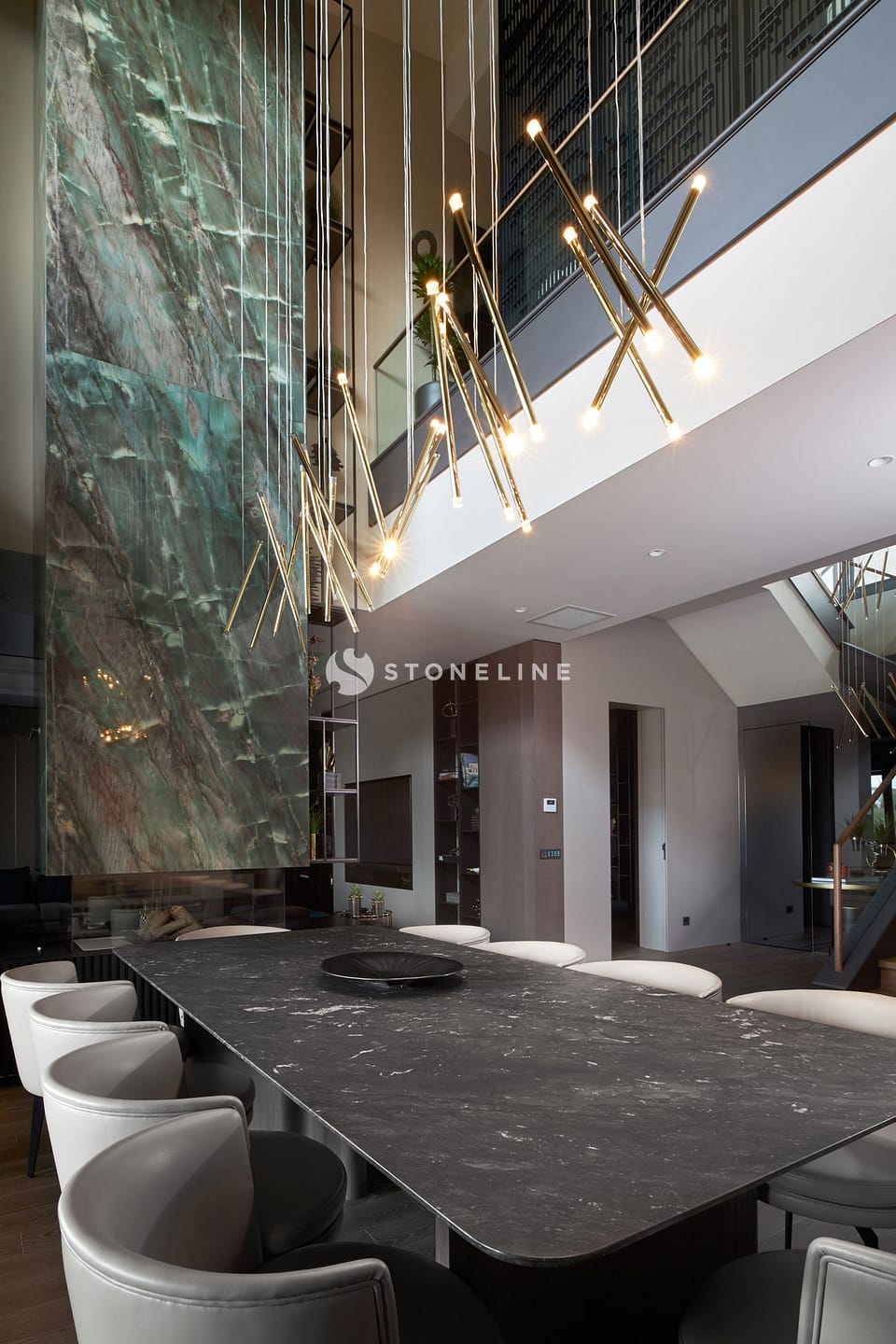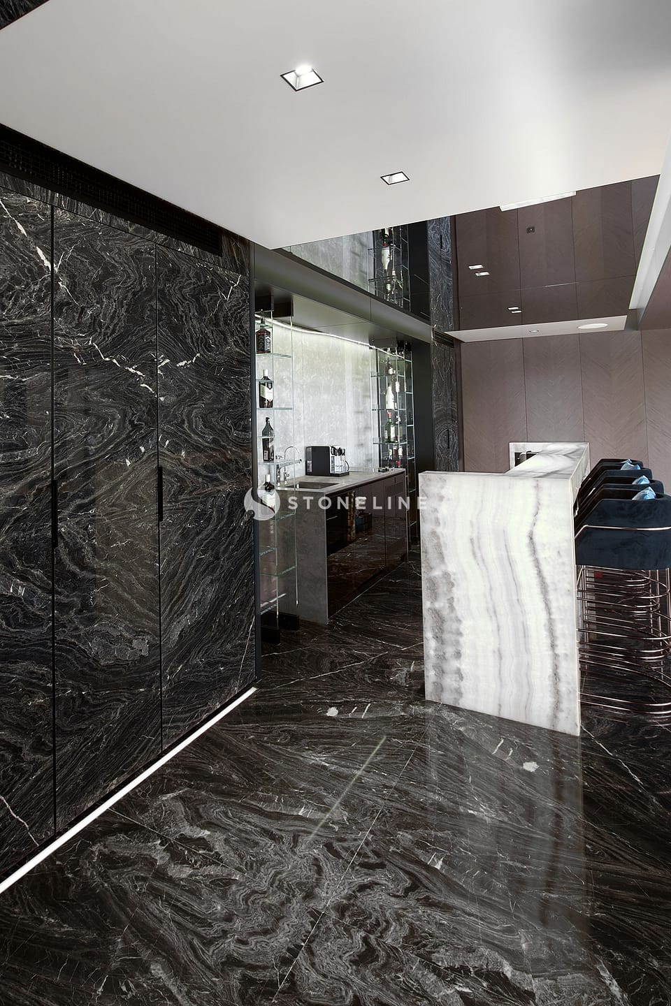 This exclusive residential project, brought to life with Stoneline’s distinguished natural stone collection, elevates modern luxury to the highest level thanks to the impressive combination of Golden Black, Onice Grey Extra, New London Grey, Emerald Quartzite and Marula stone.