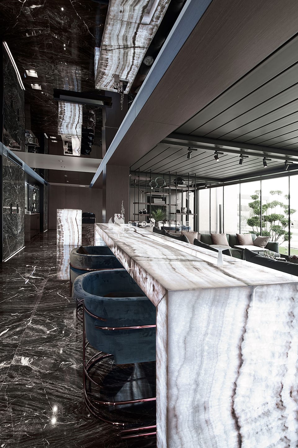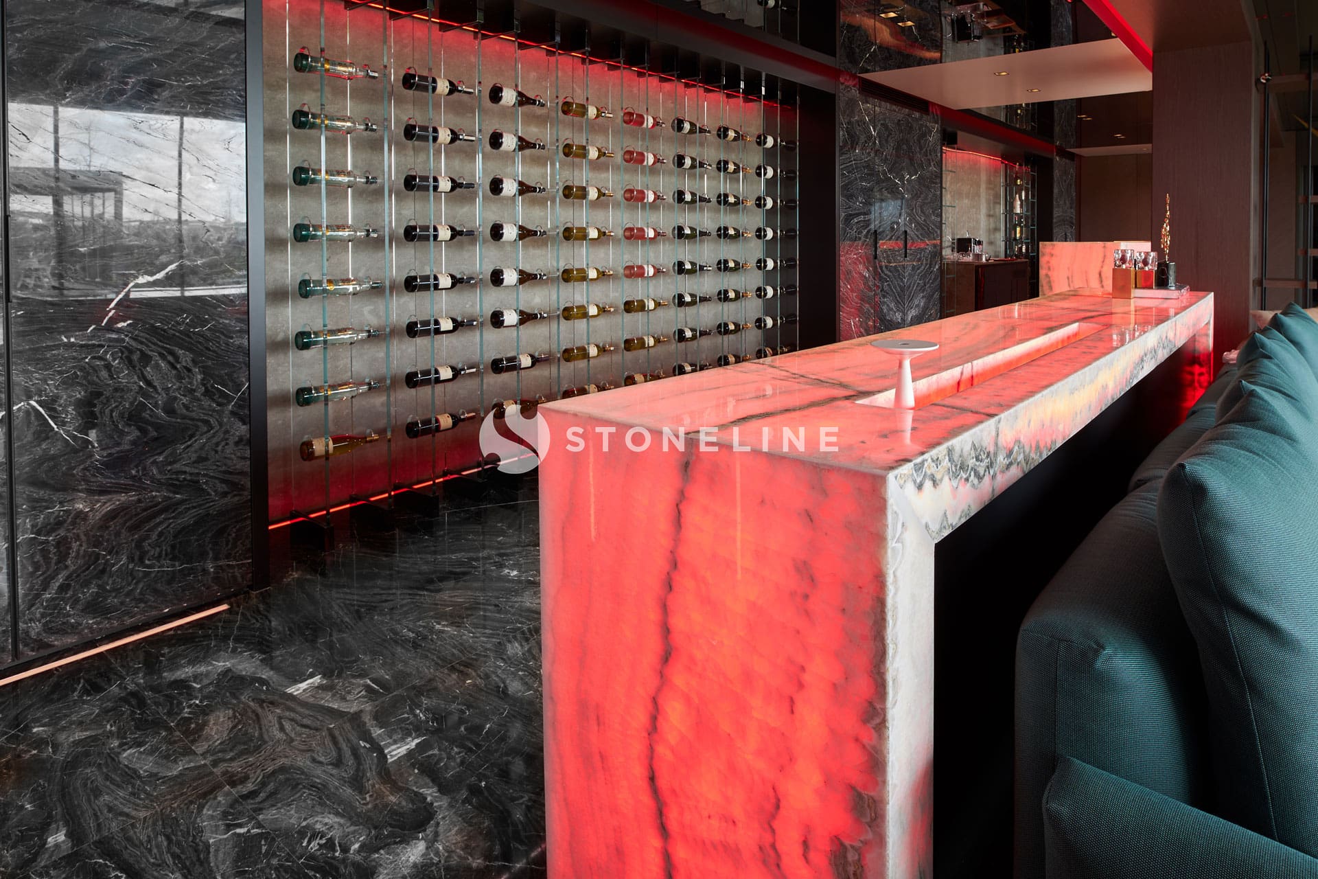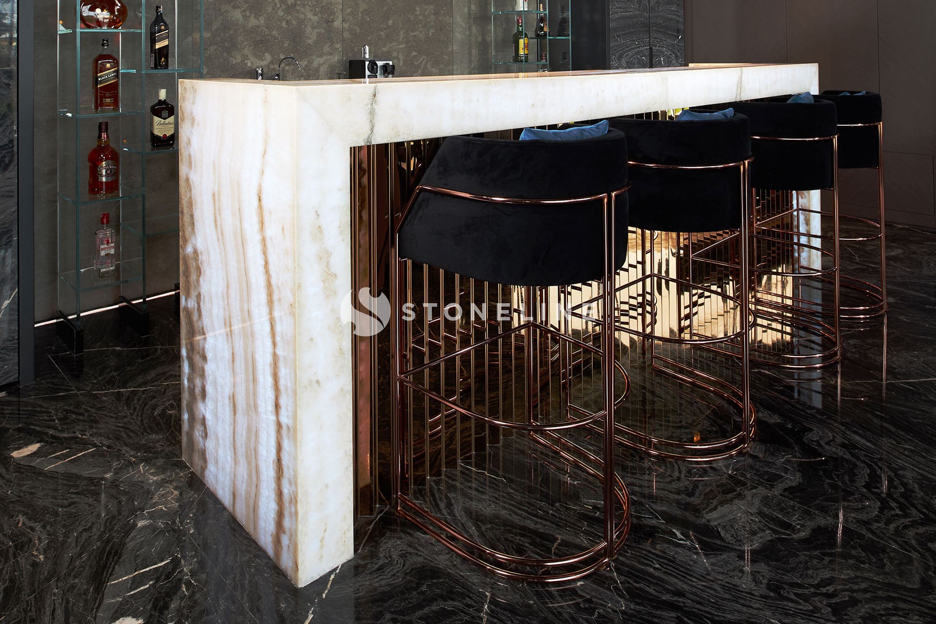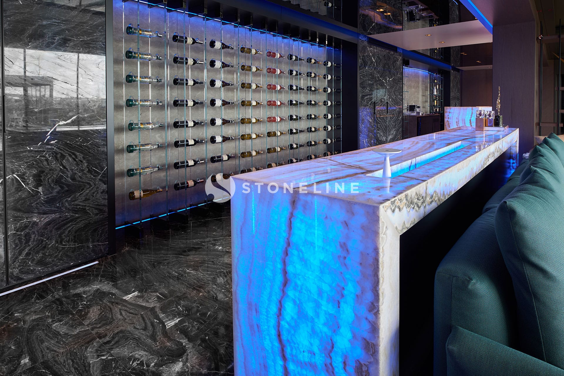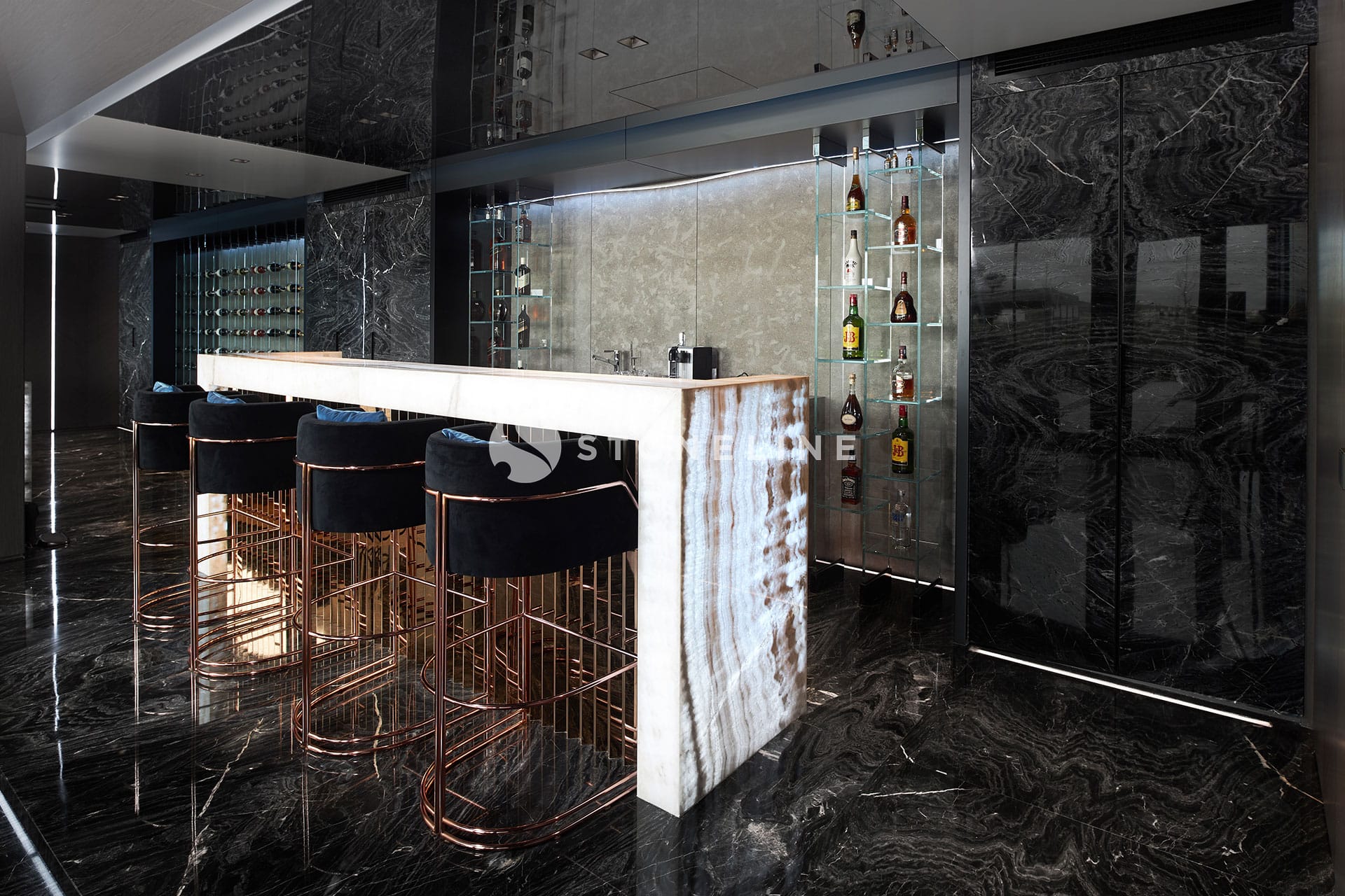 This exclusive residential project, brought to life with Stoneline’s distinguished natural stone collection, elevates modern luxury to the highest level thanks to the impressive combination of Golden Black, Onice Grey Extra, New London Grey, Emerald Quartzite and Marula stone.