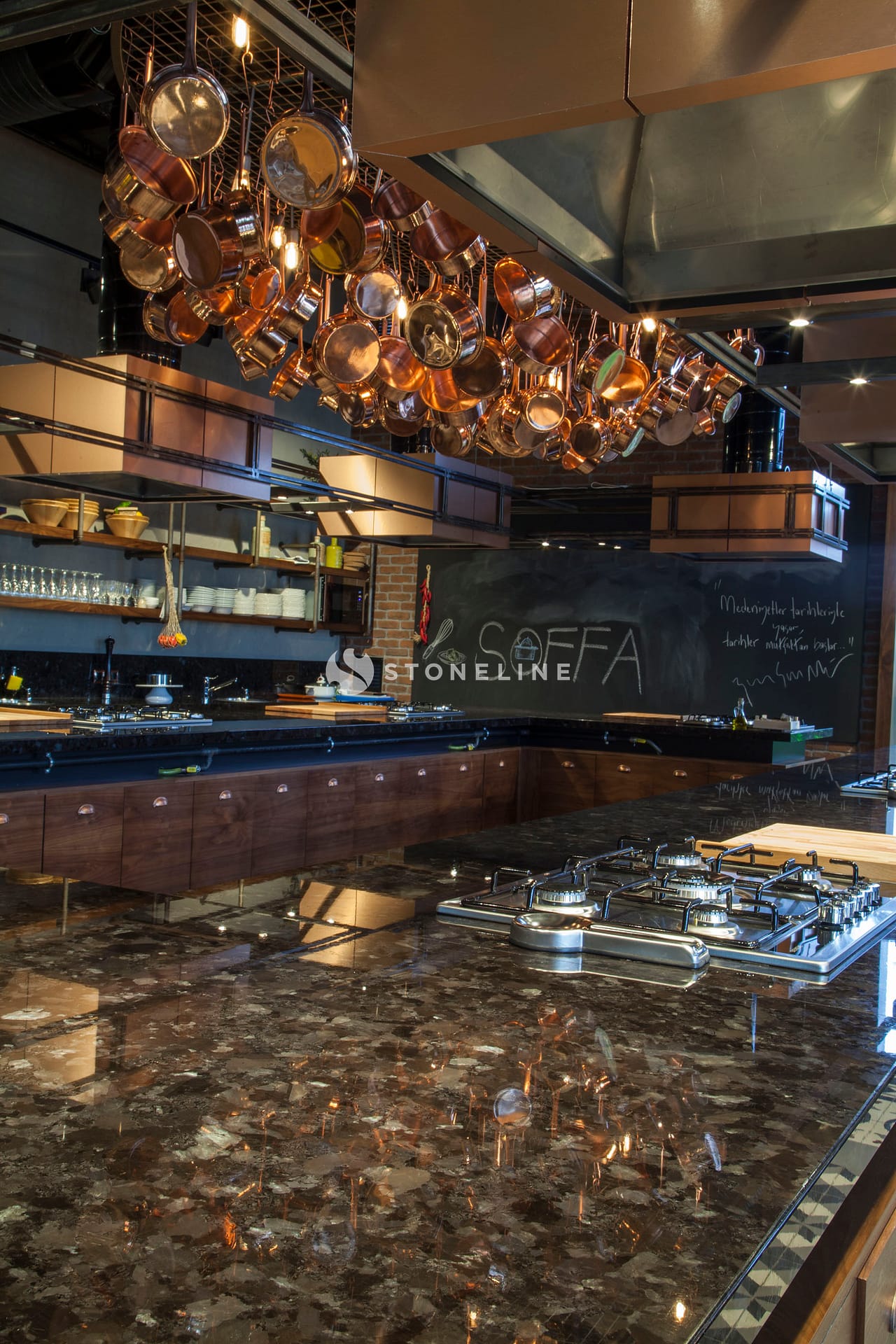Designed by Yonca Sirmen Architecture, this kitchen atelier was decorated with Black Antique for its richness in shades of black, shiny texture and surface diversity and timeless look. You can also create a whole another atmosphere by changing the surface finish of any stone in your designs. You can also discover hundreds of stones from the natural stone selection of Stoneline for your elegant designs.