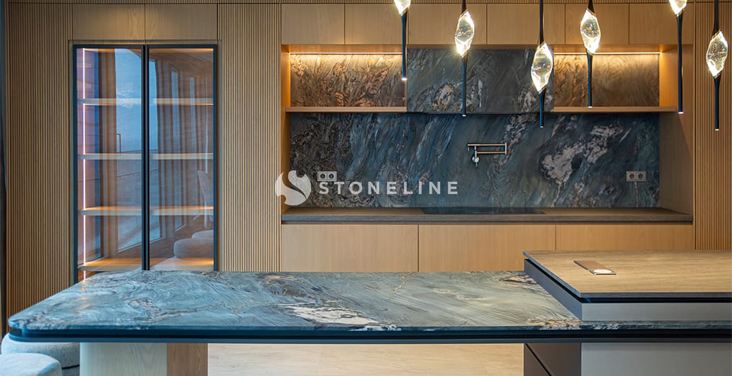Designed with Stoneline’s superior quality natural stones, this exclusive residence project stands out as a symbol of luxury and modern living. Created with the fascinating combination of Calacatta Vogue Extra, Lotus Quartzite, Cascad Extra and Poseidon stones, this project attracts attention with every detail.