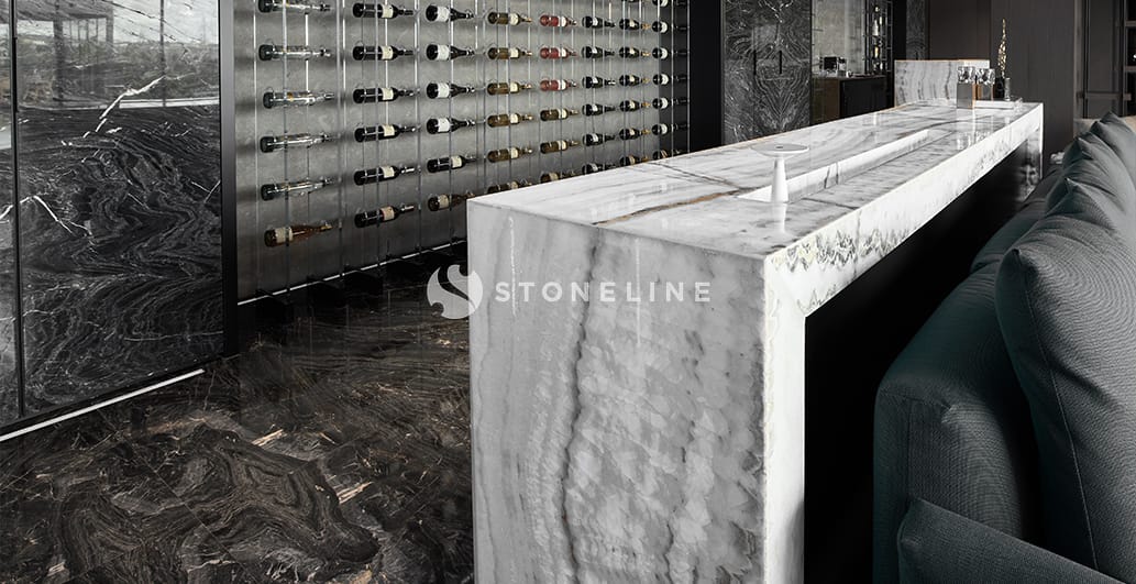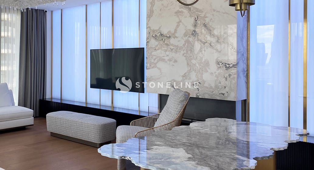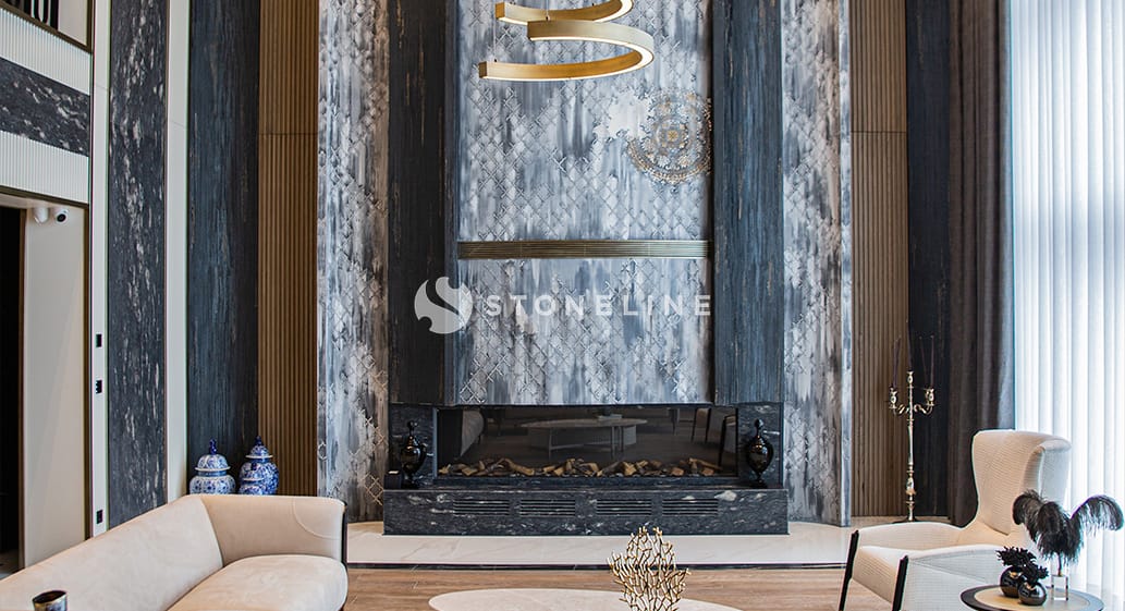 This private residence boasts a 7-meter-high fireplace covered with Emerald Quartzite featuring emerald green tones and elegant veins. The bar is adorned with translucent White Crystallino Onyx, while its background wall showcases bookmatched Golden Black marble. Reflecting the harmony between brown and grey, Marula is used for the dining table — creating a refined and timeless design. You can make use of Stoneline’s natural stone collection in your fireplace designs.