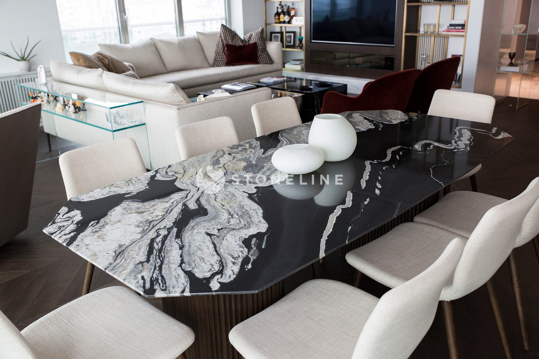 The marble table in the exclusive residential project designed with Stoneline natural stone adds a unique touch to living spaces with its elegance and durability.
