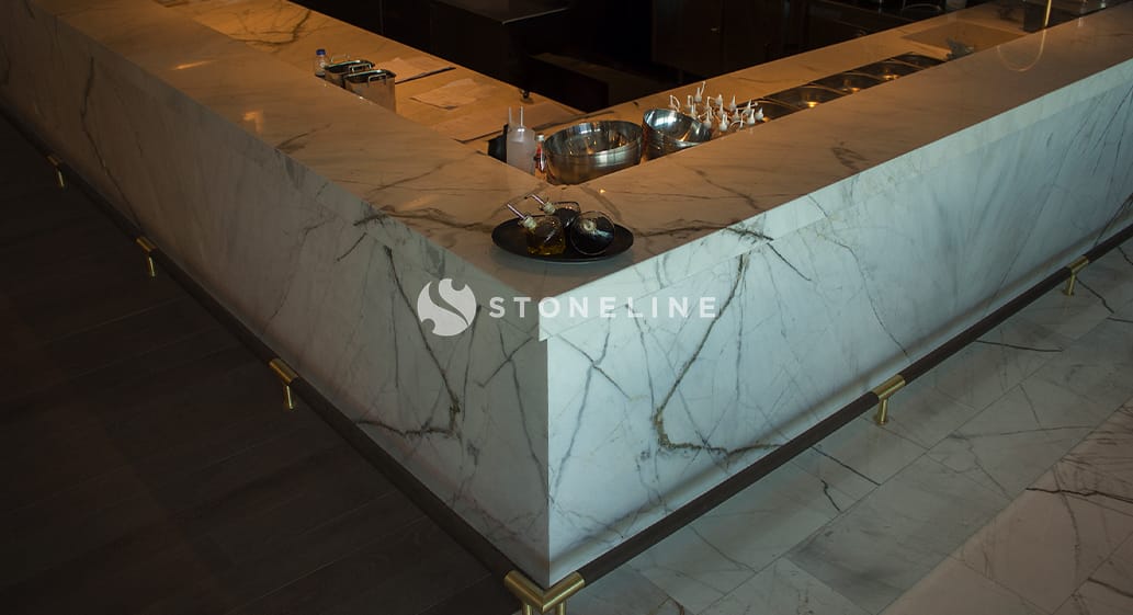 This shop project has been decorated with Arsub Classico, which makes designs unique with its colours and stunning appearance, and Italy’s finest pieces, Calacatta Vagli and Calacatta Manhattan, creating an elegant space. Caceres Dark completes this harmony. For your elegant designs, you can explore hundreds of stone varieties from Stoneline’s natural stone collection.