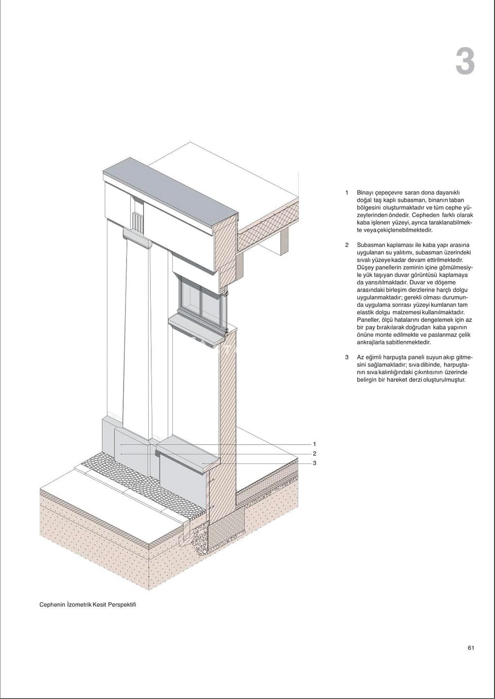 Buildings and Facades: In this section, in addition to the projects built in the last 20 years, additional structures, renovations, repairs and reconstructions are also included. The project range, which extends from two-storey houses with gable roofs to multi-storey residences, includes different typologies such as residences, offices, hotels, schools and museums built with the reinforced concrete frame building system. In the selected projects, different façade types such as front wall, ventilated natural stone clad facade or self-supporting solid elements are exemplified. While each project is introduced in outline, from almost urban planning scale to joint detail, through texts, photographs and photo captions, the relationship between design and material is also examined. The projects are examined in terms of design approaches, by classifying them as those that have a relief effect, an emphasis on massiveness, an impressive position in terms of scale and positioning when viewed from a distance, and projects that stand out with their unique relationships with the environment and their use of light and shadow effects.